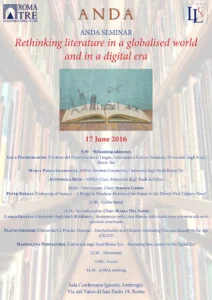 - Events 2016ANDA Seminar 2016. Rethinking Literature in a Globalised World and in a Digital Era 17 June 2016, Università degli Studi Roma Tre, Sala Conferenze Ignazio Ambrogio, Via del Valco di… Leggi tutto: Events 2016