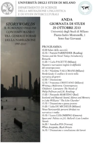 - Events 2013ANDA SEMINAR 2013. Storyworlds: Narrative Genres and Forms in the Contemporary British Novel 25 October, Dipartimento di Scienze della Mediazione Linguistica e di Studi Interculturali, Università degli Studi di Milano,… Leggi tutto: Events 2013