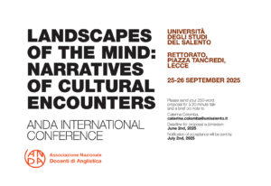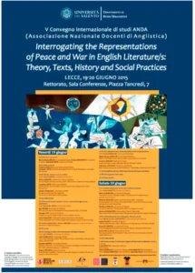 - Events 2015ANDA Conference 2015. Interrogating the Representations of Peace and War in English Literature/s: Theory, Texts, History and Social Practices 19-20 June 2015, Università del Salento, Istituto Buon Pastore, Via Taranto, 35… Leggi tutto: Events 2015